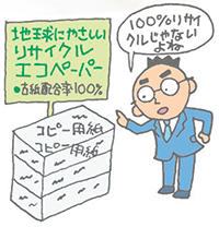 実際には、コピー用紙の原材料に用いられた古紙パルプの割合(古紙配合率)が50%程度であるにもかかわらず、あたかも「古紙100%」であるかのように表示。