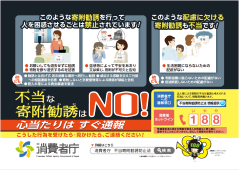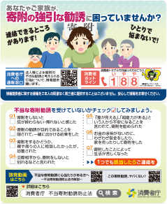 「先祖の供養をしないと、その病気は治らないですよ」と不安をあおられるなどして高額な寄附をしたり商品を購入したりしてしまった。その結果、家庭が困窮したり崩壊したりするなどの事例も発生しています。そこで、不当な寄附勧誘を防止し、被害からの救済や再発を防ぐため新たな法律が制定されました。また、消費者契約法等の改正が行われ霊感商法等による被害の救済が拡充されました。ご自身や周りの方が被害に遭った場合は、まずは消費者ホットライン188にご相談ください。